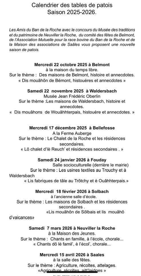 26ème édition des tables de patois Les Amis du Ban de la Roche vous proposent de les retrouver dès le...