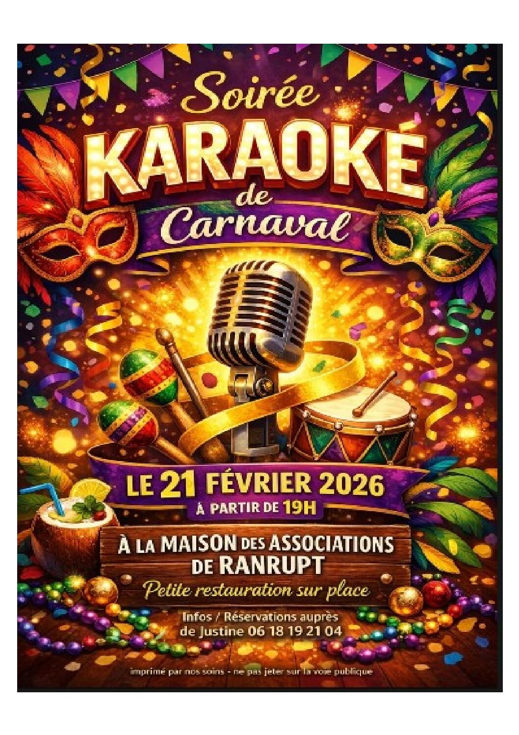 Soirée karaoké de carnaval Samedi 21 février 2026 à partir de 19h00 Maison des Associations de Ranrupt karaoké carnaval 21.02.2026